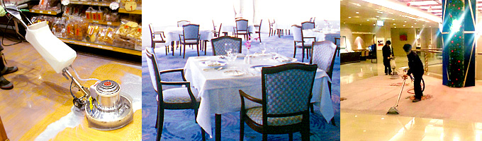 専用機材を用いて、床の洗浄、ワックスがけ、ガラス清掃、絨毯(カーペット)クリーニングなどを定期的に行います。